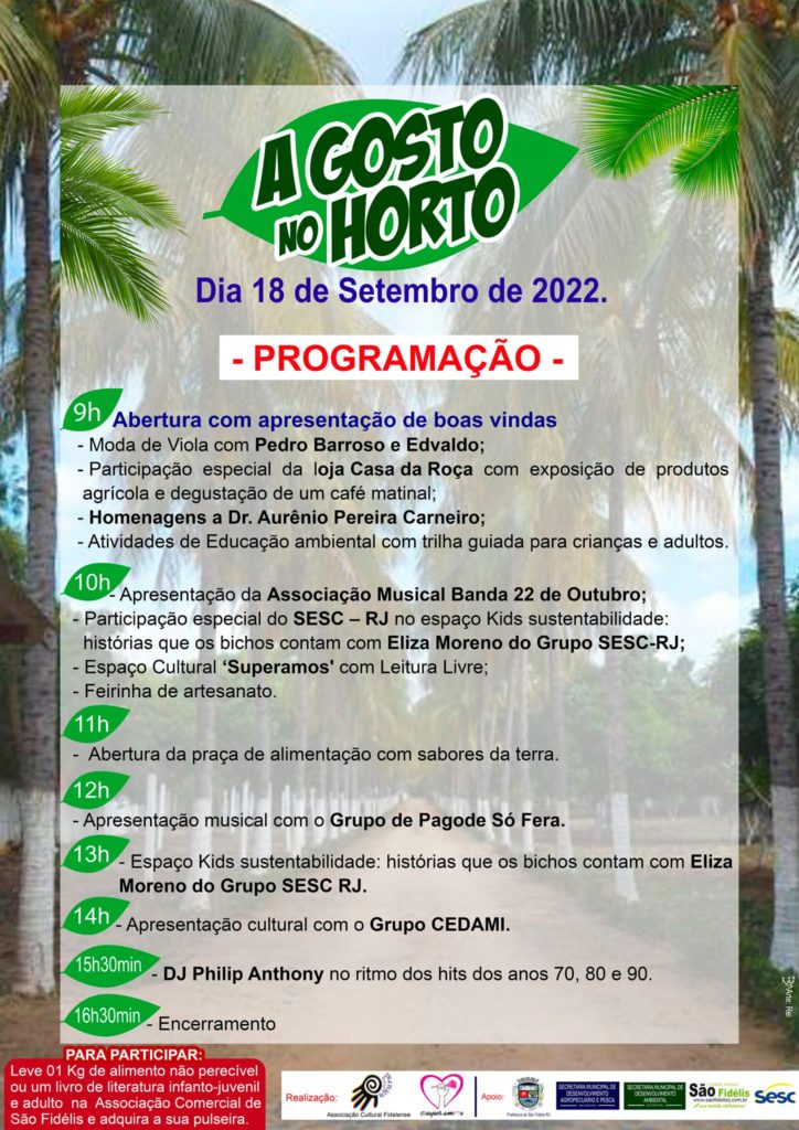 Um evento cultural, ambiental, social, entretenimento e lazer e solidário. Assim é a proposta do evento organizado pela Associação Cultural Fidelense. O evento visa oferecer uma série de ações positivas e proativas, aproveitando um espaço tal como é o Horto Municipal para agregar valores e oportunidades ímpares que o local oferece. Tendo em vista que nos últimos dois anos com a pandemia, quase tudo parou no tempo. No entanto, a retomada das atividades socioambientais e culturais são importantes para o desenvolvimento humano em seus mais variados aspectos.