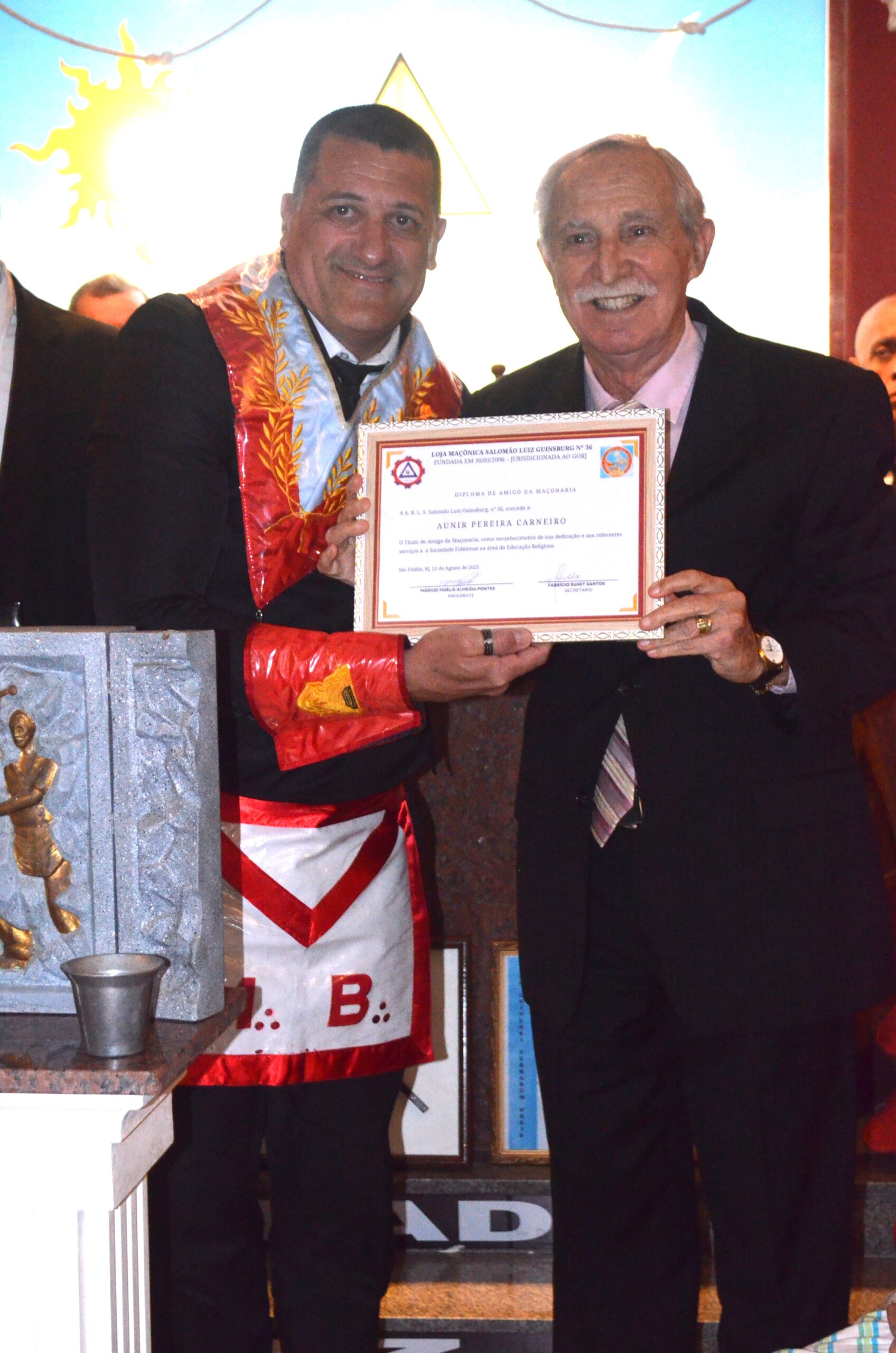 Loja Maçônica Salomão Luiz Ginsburg nº36 – realizou na noite de quinta -feira (21) em comemoração ao dia do maçom cuja data é 20 de agosto, uma sessão especial para homenagear alguns fidelenses que se destacam/destacaram na cidade e Região. Entre os homenageados destacam-se: Aurélio Pereira Carneiro, pastor Aunir Pereira Carneiro, Dr. Inavaldo Berriel Pontes, Maria Helena Coelho, Namir Machado Jorge e Leyla Rodrigues Macedo.